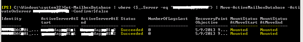 Get-MailboxDatabase | where {$_.Server -eq “Server01”} | Move-ActiveMailboxDatabase -ActivateOnServer Server02 -Confirm:$false