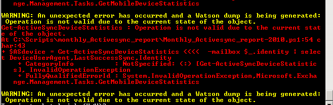 One thought on “Exchange 2010 Power-shell script error: WARNING: An unexpected error has occurred and a Watson dump is being generated