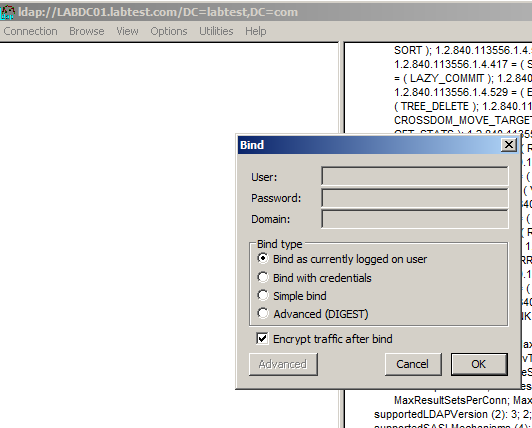 - Connection –> Bind with username & password or with currently logged in user if it has admin rights.