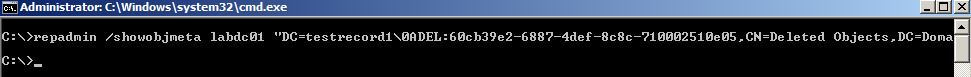 repadmin /showobjmeta labdc01 “DC=testrecord1ADEL:60cb39e2-6887-4def-8c8c-710002510e05,CN=Deleted Objects,DC=DomainDnsZones,DC=labtest,DC=com” >c:\dnsaudit.txt