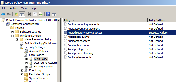 Here are the steps that you have to follow to enable it, first step is to enable the Auditing on “directory service access”.