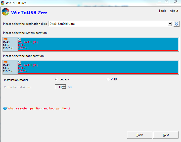 4. Select the System /MBR partition and installation mode as legacy(with VHD mode, windows 10 was loading slower as per I had experienced)