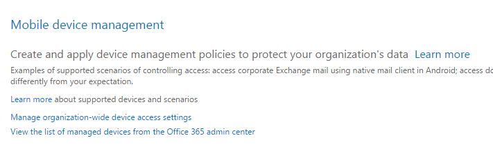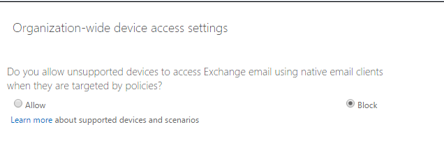 13. You can change the Manage Organization policy setting to Block if you don’t want unsupported devices to access Exchange.