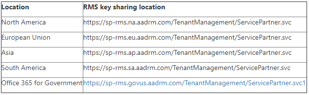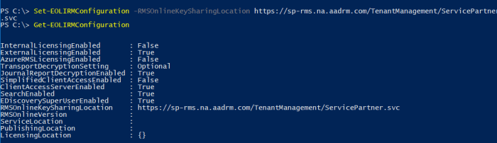 Set-IRMConfiguration -RMSOnlineKeySharingLocation https://sp-rms.na.aadrm.com/TenantManagement/ServicePartner.svc