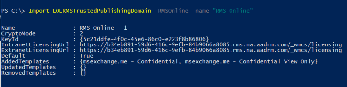 Import-RMSTrustedPublishingDomain -RMSOnline -name “RMS Online”