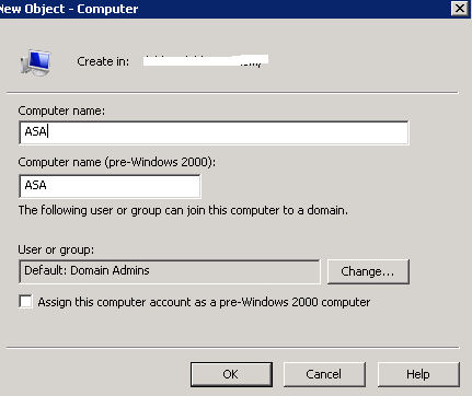 Create a Computer account in Active Directory and Name it ASA. (do not create User account as you normally do, although it can be done but than you need to set its password to never expire etc and bypass some of the organizational policies)