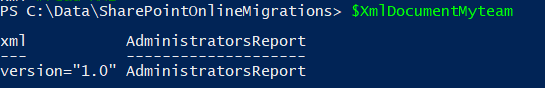 [xml]$XmlDocumentMyteam = Get-Content -Path .\Temp\Myteam-SPAdministratorsReport.xml #read XML file