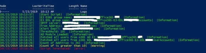 .\EOLLicenseCompliancegroupbased.ps1 -Group1 “O365ALLUsersE3” -Group2 “EOLLicenseADgroup” -smtpserver smtpserver -from donotreply@labtest.com -erroremail logs@labtest.com -count 10