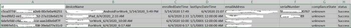 $mcoll = “” | Select id,deviceName,enrolledDateTime,lastSyncDateTime,emailAddress,serialNumber,complianceState,status