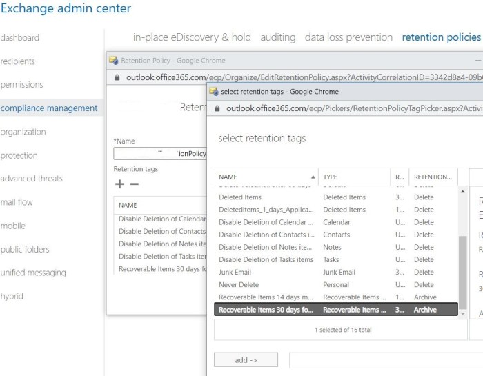 3. Enable retention-tag that will move recoverable items from primary mailbox to archive mailbox