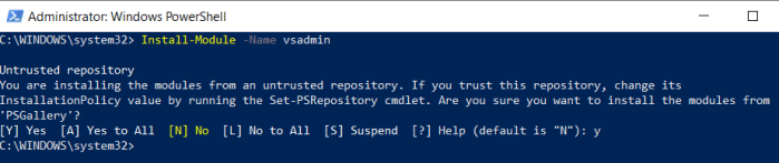 Use the command –> Install-Module -Name vsadmin (run in powershell as administrator)