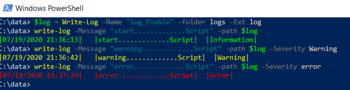 write-log -Message “warning………….Script” -path $log -Severity Warning #you can display warning using the severity