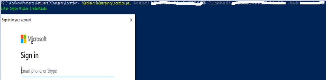 .\GetUsersInEmergencyLocation.ps1 -locationid 2e8776860-0e59-40876-a169-068898a52798 -CivicAddressId cc55asbd-aecb-4a4a-8a9c-d788326ea -domain labtest