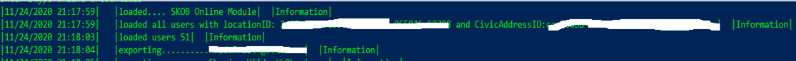 [Parameter(ParameterSetName = 'Create',Position = 0)][switch]$Create, [Parameter(Mandatory = $true,ParameterSetName = 'Message')] [String]$message, [Parameter(Mandatory = $true,ParameterSetName = 'Message')] [String]$path, [Parameter(Mandatory = $false,ParameterSetName = 'Message')] [ValidateSet('Information','Warning','Error')] [string]$Severity = 'Information', [Parameter(ParameterSetName = 'Message',Position = 0)][Switch]$MSG ) switch ($PsCmdlet.ParameterSetName) { "Create" { $log = @() $date1 = Get-Date -Format d $date1 = $date1.ToString().Replace("/", "-") $time = Get-Date -Format t $time = $time.ToString().Replace(":", "-") $time = $time.ToString().Replace(" ", "") New-FolderCreation -foldername $folder foreach ($n in $Name) {$log += (Get-Location).Path + "\" + $folder + "\" + $n + "_" + $date1 + "_" + $time + "_.$Ext"} return $log } "Message" { $date = Get-Date $concatmessage = "|$date" + "| |" + $message +"| |" + "$Severity|" switch($Severity){ "Information"{Write-Host -Object $concatmessage -ForegroundColor Green} "Warning"{Write-Host -Object $concatmessage -ForegroundColor Yellow} "Error"{Write-Host -Object $concatmessage -ForegroundColor Red} } Add-Content -Path $path -Value $concatmessage } } } #Function Write-Log ###########Logs and reports $log = Write-Log -Name "GetUsersInEmergencyLocation-Log" -folder "logs" -Ext "log" $Report = Write-Log -Name "GetUsersInEmergencyLocation-Report" -folder "Report" -Ext "csv" ##########connect to SOl try { LaunchSOL -Domain $domain Write-log -message "loaded…. SKOB Online Module" -path $log } catch { $exception = $_.Exception Write-Log -Message "Error loading Module" -path $log -Severity Error Write-Log -Message $exception -path $log -Severity error exit; } # Write-log -message "loaded all users with locationID: $locationid and CivicAddressID:$CivicAddressId" -path $log $users = Get-SOLCsOnlineVoiceUser -LocationId $locationid -CivicAddressId $CivicAddressId Write-log -message "loaded users $($users.count)" -path $log $collection =@() foreach($u in $users){ $mcoll = "" | Select-Object Name, userprincipalName, locationid, CivicAddressId, Number $csuser = get-solcsonlineuser -identity $u.id | Select-Object userprincipalname $mcoll.Name = $u.name $mcoll.userprincipalName = $csuser.userprincipalname $mcoll.locationid = $locationid $mcoll.CivicAddressId = $CivicAddressId $mcoll.Number = $u.Number $collection+=$mcoll Write-log -message "exporting……….$($csuser.userprincipalname)" -path $log } Write-log -message "export to CSV file" -path $log $collection | Export-Csv $report -NoTypeInformation Write-log -message "Removing SKOB Online Shell" -path $log RemoveSOL #