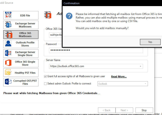 For demonstration purposes, I will be connecting to my o365 tenant as a test, you need to have full access permission to the mailboxes in order to export them to PST.