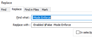 Open the XML file of first Tenant as well in the Notepad++ , Use Cntrl + H and replace -Mode Enforce to -Enabled $False -Mode Enforce