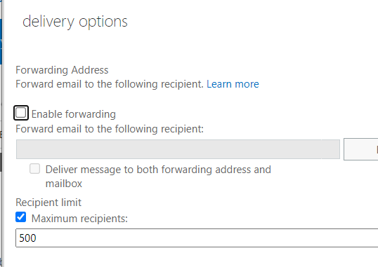 Now go to ECP and update the Default Role Assignment Policy, uncheck MyBaseOptions and Check MyBaseOptions-DisableAutoForwarding