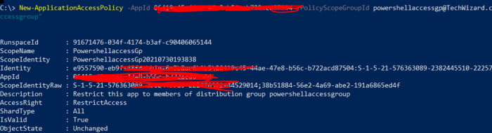 New-ApplicationAccessPolicy -AppId 06419c45-45ge-47e8-b56c-b734acrg4504 -PolicyScopeGroupId powershellaccessgroup@TechWizard.cloud -AccessRight DenyAccess -Description “Restrict this app to members of distribution group powershellaccessgroup”