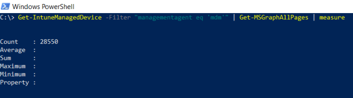 Get-IntuneManagedDevice -Filter “managementagent eq ‘mdm'” | Get-MSGraphAllPages