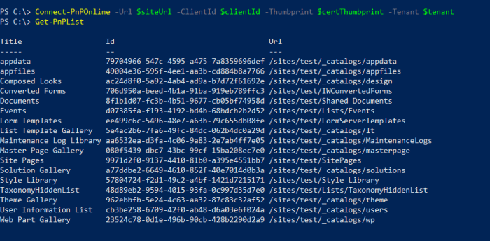 Connect-PnPOnline -Url $siteUrl -ClientId $clientId -Thumbprint $certThumbprint -Tenant $tenant
