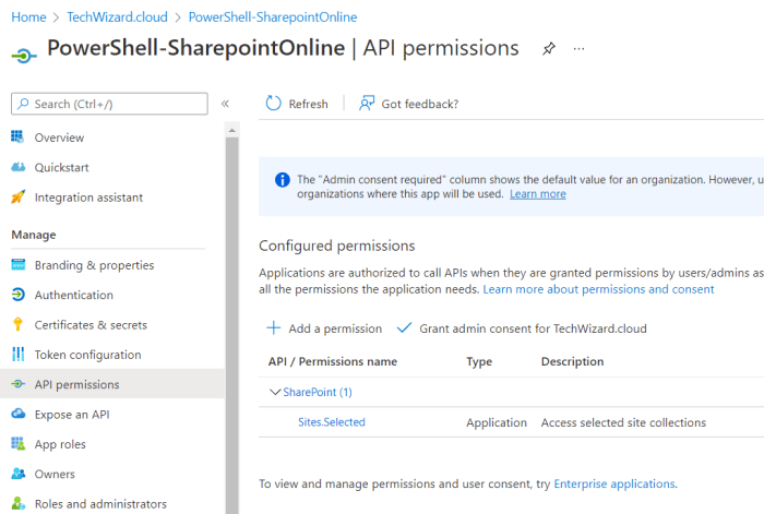 $writeperm = Grant-PnPAzureADAppSitePermission -Permissions “Write” -Site $siteUrl -AppId $clientId -DisplayName “PowerShell-SharepointOnline”