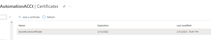 Go to Azure Automation Account à Certificates