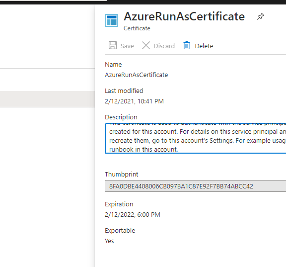 Add your own Certificate, Certificate Name should always be AzureRunAsCertificate