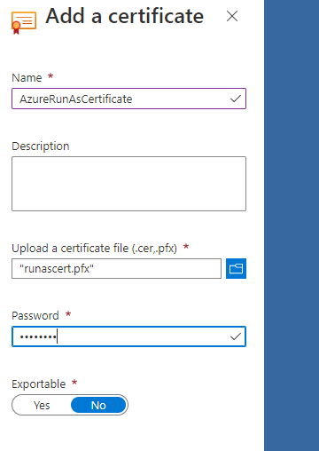 Now we will upload private certificate to azure automation run as account.